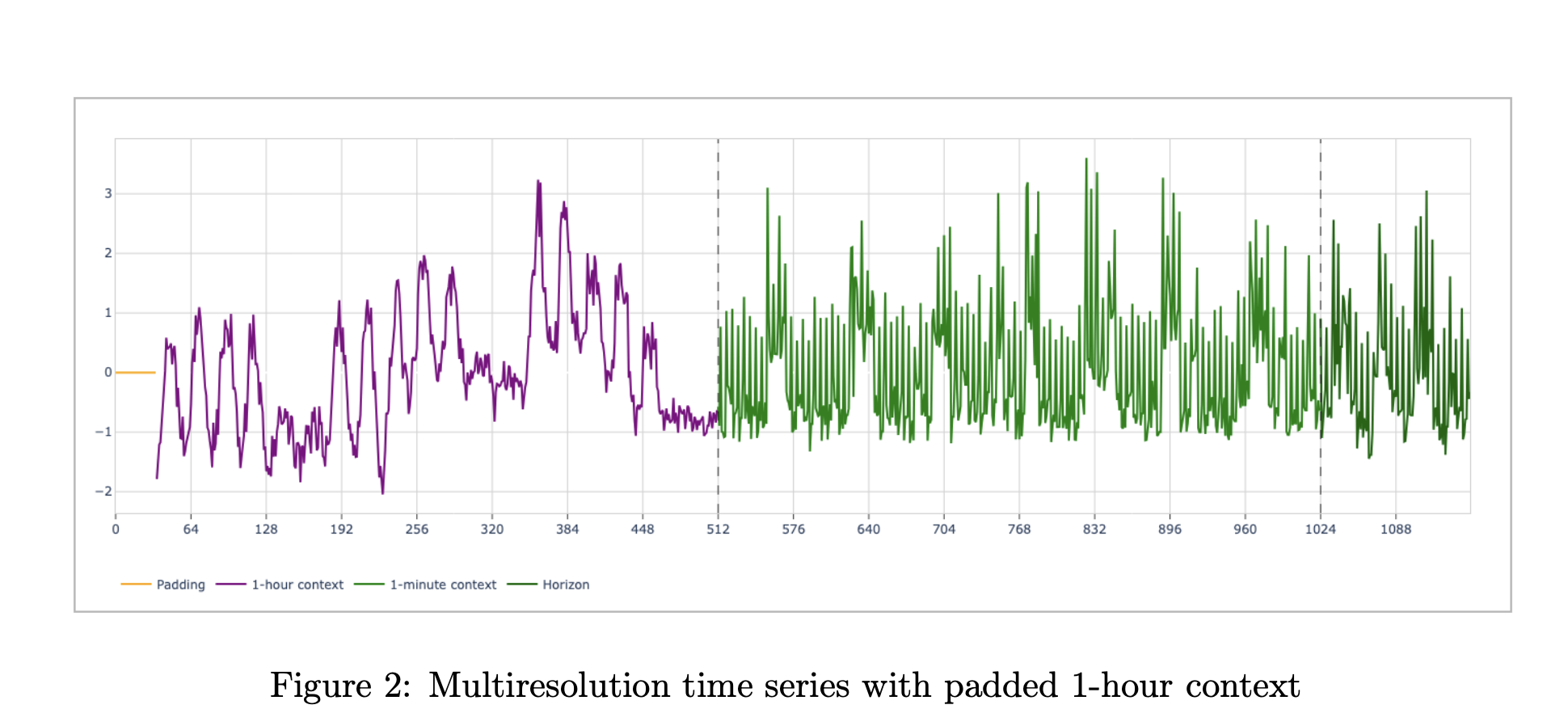 Formally, the model consumes a pair of contexts, (xc, xf). The coarse context (x_c) and the fine context (x_f) each have length up to 512. The spacing of (xc) is fixed at 60 times the spacing of (xf). A typical observability setup uses 512 hours of 1 hour aggregates and 512 minutes of 1 minute values. Both series terminate at the same forecast cut point. The model predicts a horizon of 128 points at the fine resolution, with a mean and a set of quantiles from 0.1 to 0.9.